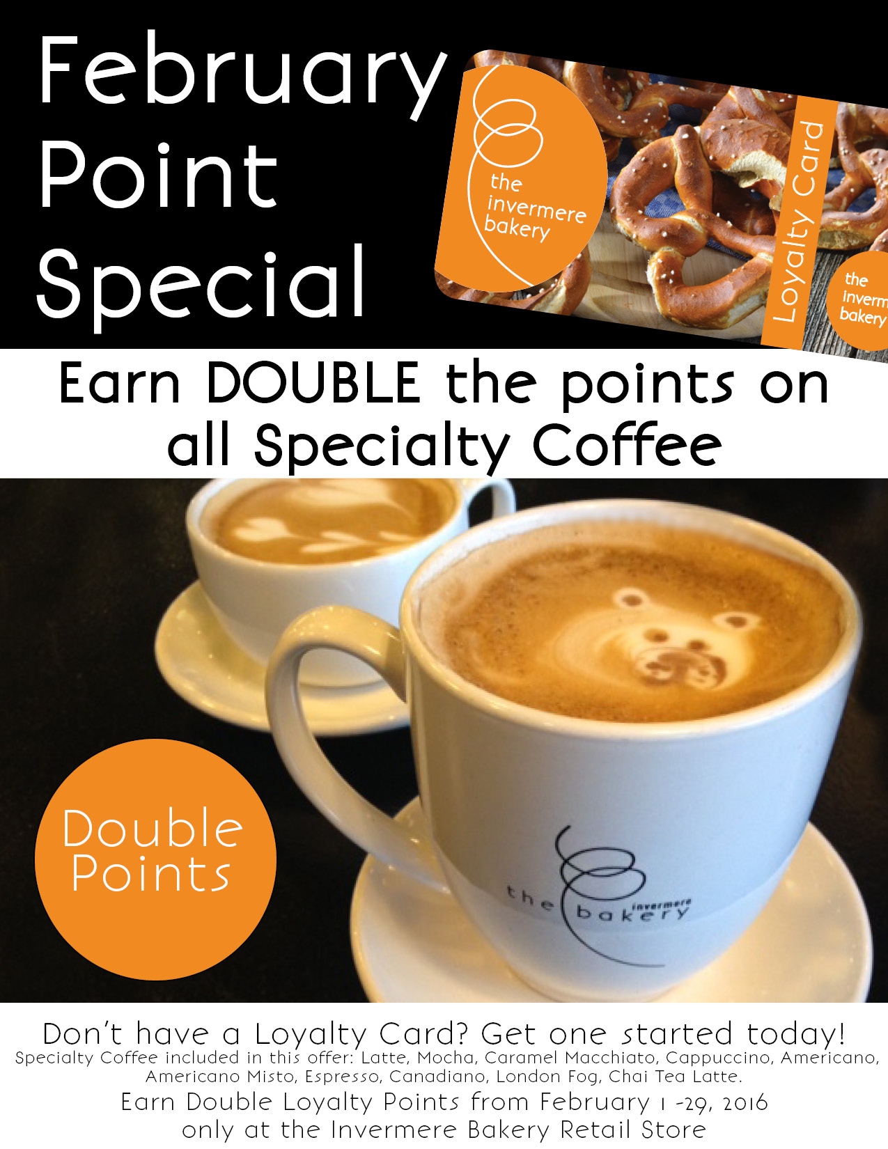 February 2016 Loyalty Points By Rhian Silvennoinen Posted February 1, 2016 In Points February 2016 Loyalty Points2016-02-012016-02-01https://www.invermerebakery.com/wp-content/uploads/2017/10/thebakery_invermere_logo-1.pngThe Invermere Bakeryhttps://www.invermerebakery.com/wp-content/uploads/2016/02/point-Special-Feb.jpg200px200px 0 Do you come in for a latte every morning? Or do you prefer an Americano? Whatever your specialty coffee of choice is, you can earn DOUBLE the points this month only at The Invermere Bakery. Recent PostsDoggy Treats Double your PointsMatcha Latte in MayCherry-filled Lemon-Glazed DonutInvermere Bakery Sandwiches