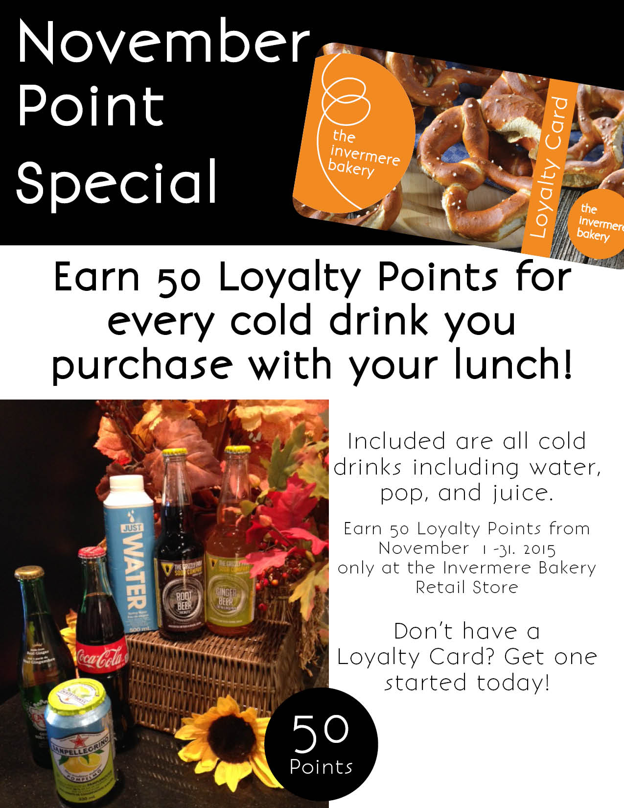For the month of November use our loyalty card when you purchase your lunch item and we will give you 50 points for every cold drink you purchase! Included are all cold drinks including water, pop, and juice.
